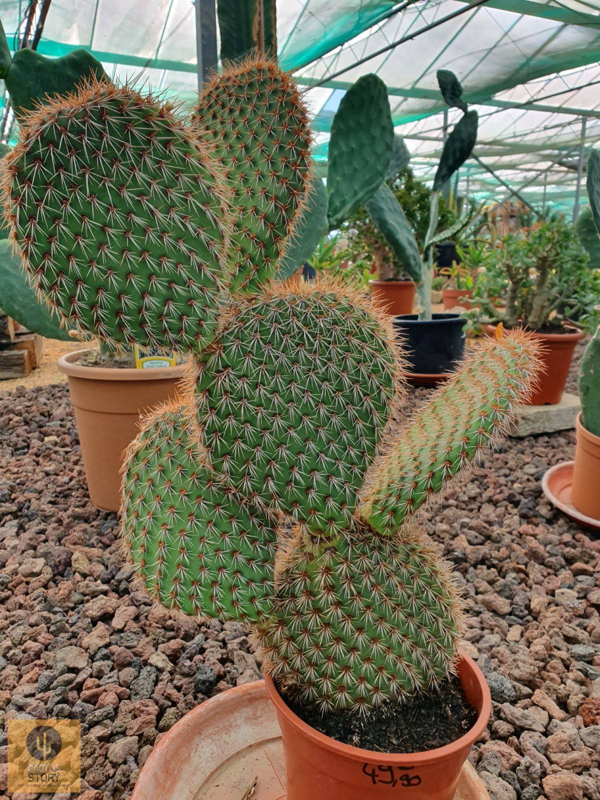 De la famille des cactées, l'opuntia pycnantha est une plante sous-arbustives à arborescentes (hauteur max. env. 1 mètre). Opuntia assez agressive avec des fleurs au périanthe cupuliforme (pétales jaune à bord rouge).