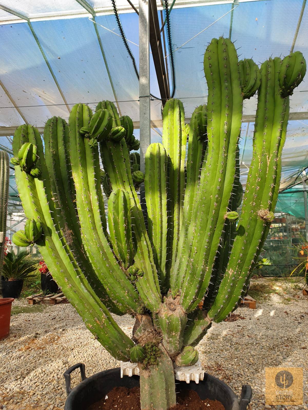Cactus colonnaire élancé et arborescent, se ramifiant dès la base à partir des rejets. Les tiges vert pale font de 5 à 7 cm d'épaisseur et portent de 7 à 12 cotes aiguës divisées par des sinus renflés de 2 cm. De 4 à 5 mètres de haut, sa floraison diurne est visible en été. Ses fleurs blanc crème à jaune verdâtre striés d'une bande médiane rougeâtre.