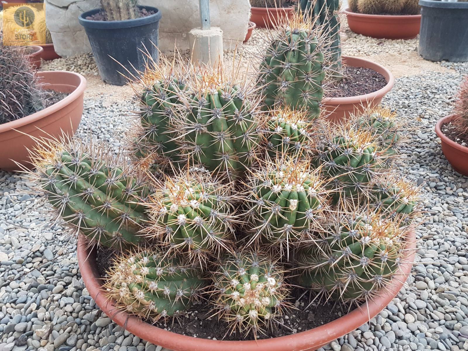 9-11 côtes basses et arrondies aux grandes aréoles blanches espacées de 2-3cm, portant des épines effilées jaune brunâtre, 1 à plusieurs centrales de jusqu'à 10cm de long et 10 ou plus radiales de jusqu'à 4cm de long.